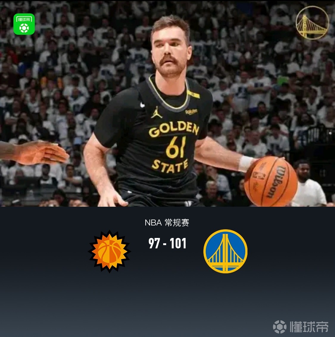 第四节,开节太阳延续势头吉莱斯皮连续三分一波8-0领先14分,随后太阳进攻断电,勇士理查德、格林、霍福德相继三分,节中追至7分,后半节太阳进攻依旧低迷,勇士霍福德内外连得5分迫近至2分,比赛来到最后1分钟太阳继续哑火,勇士梅尔顿、桑托斯一波6-0反超拿下比赛,最终太阳97-101不敌勇士。