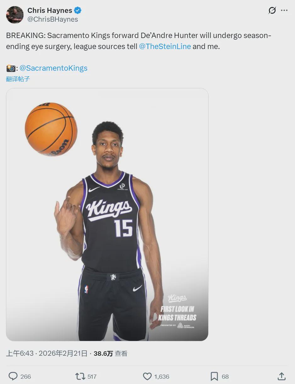 北京时间2月21日上午,据NBA名记Chris Haynes报道,国王前锋德安德烈-亨特接受眼部手术,本赛季报销!最近三天,国王已经有三名主力赛季报销:小萨博尼斯接受左膝半月板撕裂修复手术;拉文接受右手无名指肌腱修复手术。