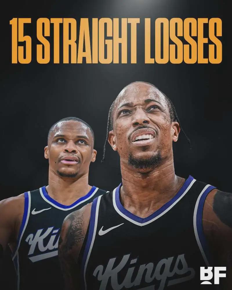 目前国王队12胜45负,联盟倒数第一。已经遭遇15连败,创造78年队史最长连败纪录。国王队前身是罗切斯特皇家队,1948年成立并加入NBA。之后又更名辛辛那提皇家队、堪萨斯城国王队等,1960年和1972年两次遭遇14连败!