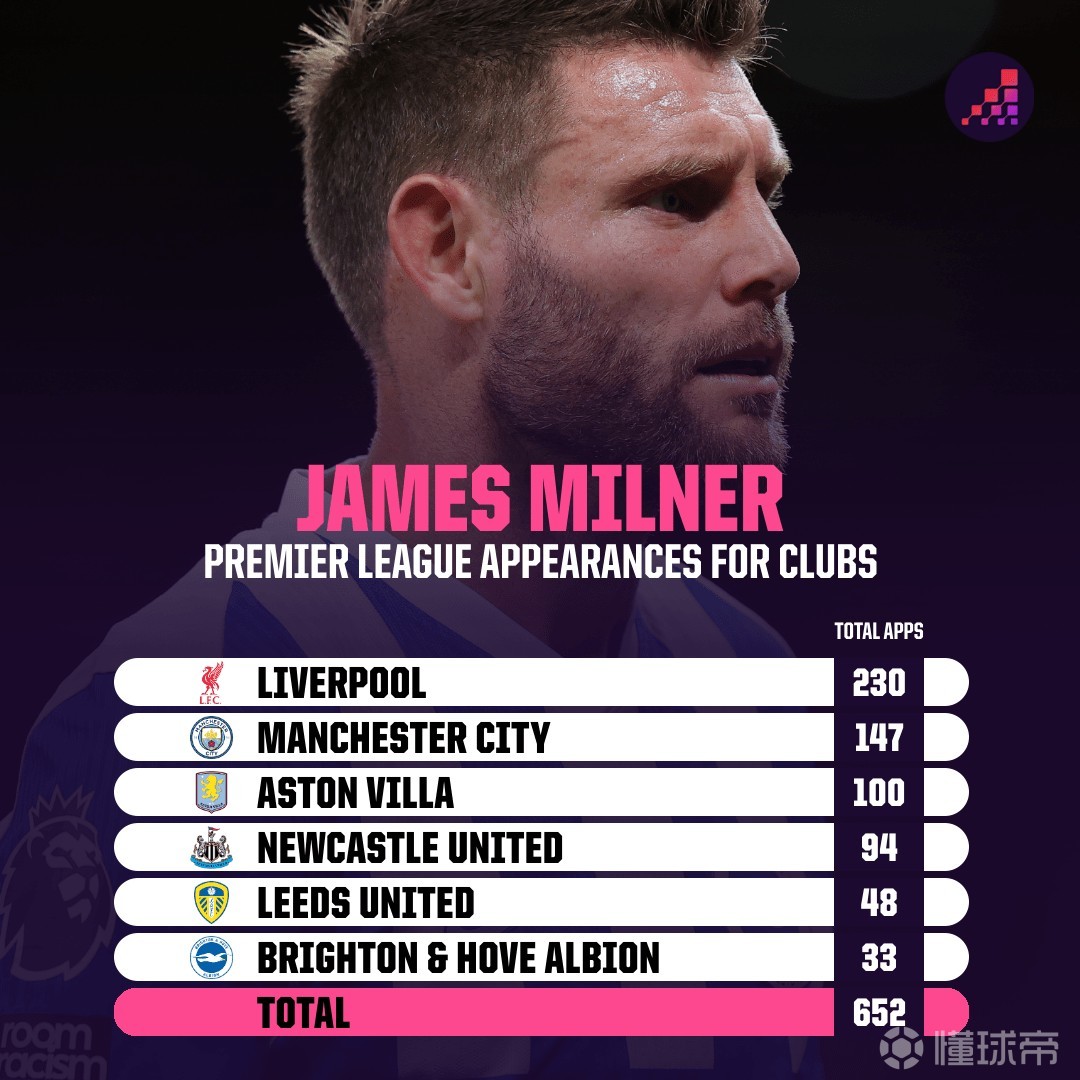 2002年11月10日,年仅16岁的米尔纳在利兹联完成英超首秀,此后这位英格兰中场还代表纽卡、维拉、曼城、利物浦、布莱顿出战英超比赛。