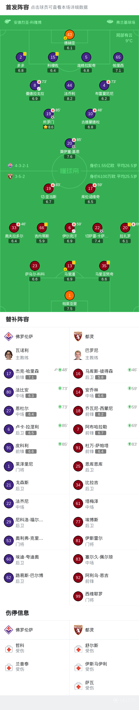 第26分钟,伊尔克汗传中,卡萨代伊头球破门,都灵1-0佛罗伦萨