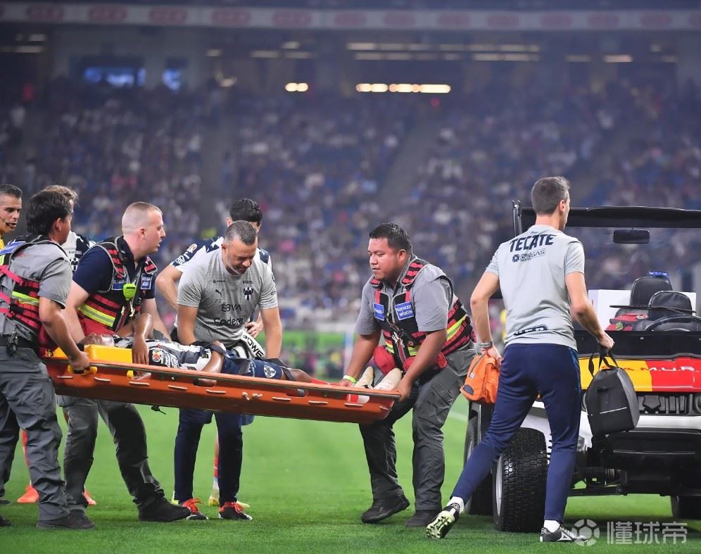 前曼联球员安东尼-马夏尔在为蒙特雷效力时肩关节脱臼,被迫被担架抬离场。