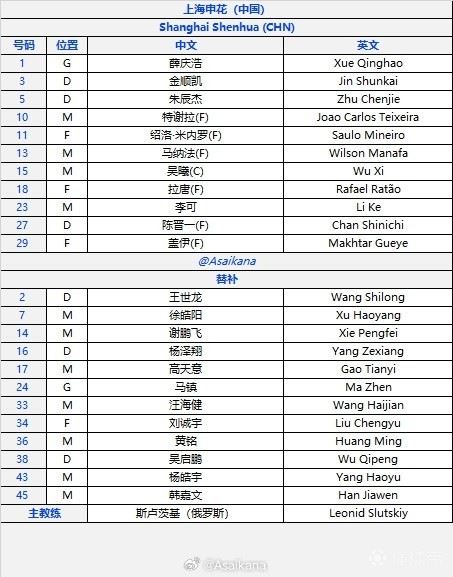 北京时间2月17日20:15,亚冠精英联赛阶段第8轮,上海申花客战武里南联。赛前首发公布。