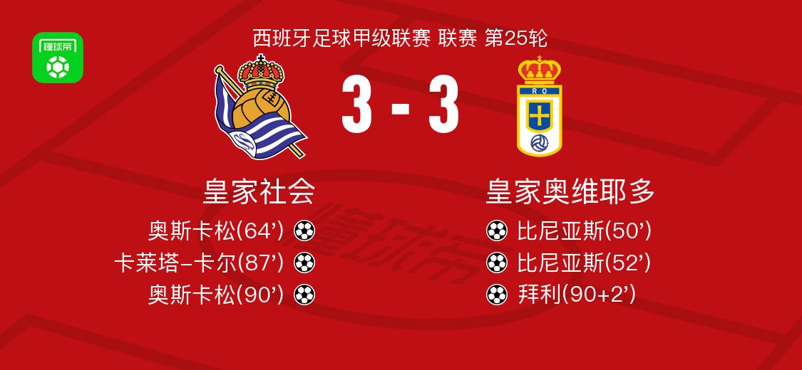 北京时间2月21日西班牙足球甲级联赛 联赛 第25轮,皇家社会主场对阵皇家奥维耶多。皇家社会奥斯卡松梅开二度,卡莱塔-卡尔破门。皇家奥维耶多比尼亚斯梅开二度,拜利破门。最终比分皇家社会 3-3 皇家奥维耶多。