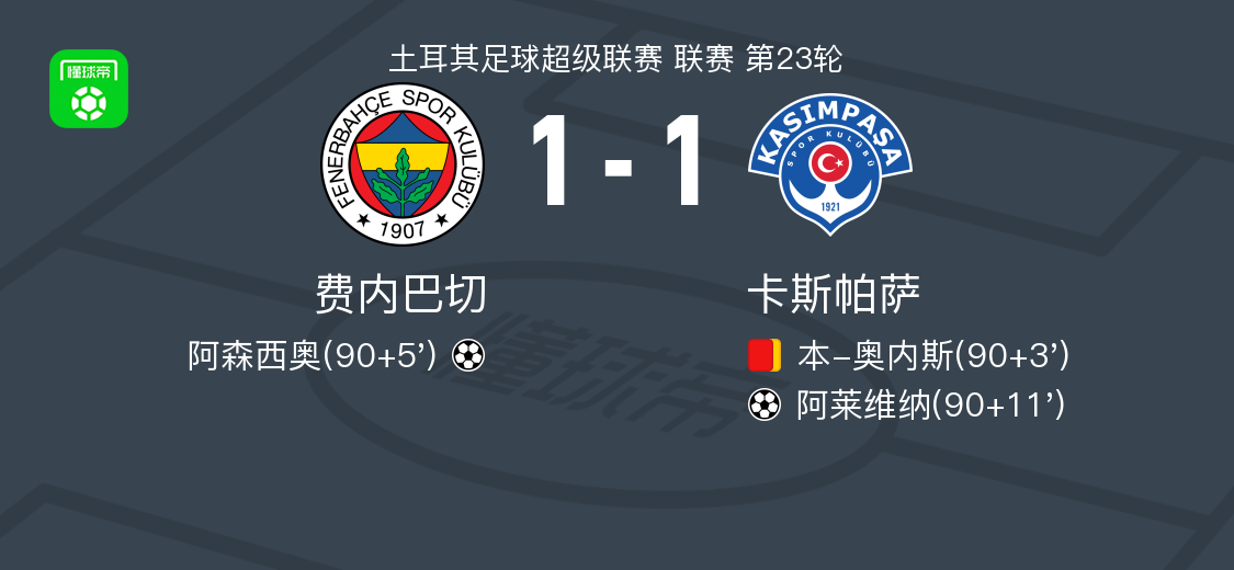北京时间2月24日土耳其足球超级联赛 联赛 第23轮,费内巴切主场对阵卡斯帕萨。费内巴切阿森西奥破门。卡斯帕萨阿莱维纳破门。最终比分费内巴切 1-1 卡斯帕萨。