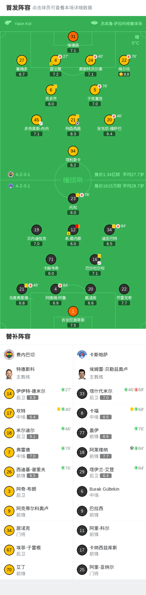 下半场补时第3分钟,卡斯帕萨球队本-奥内斯吃到第二张黄牌。