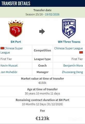 • 德转:明天从上海海港加盟武汉三镇的转会费约100万人民币