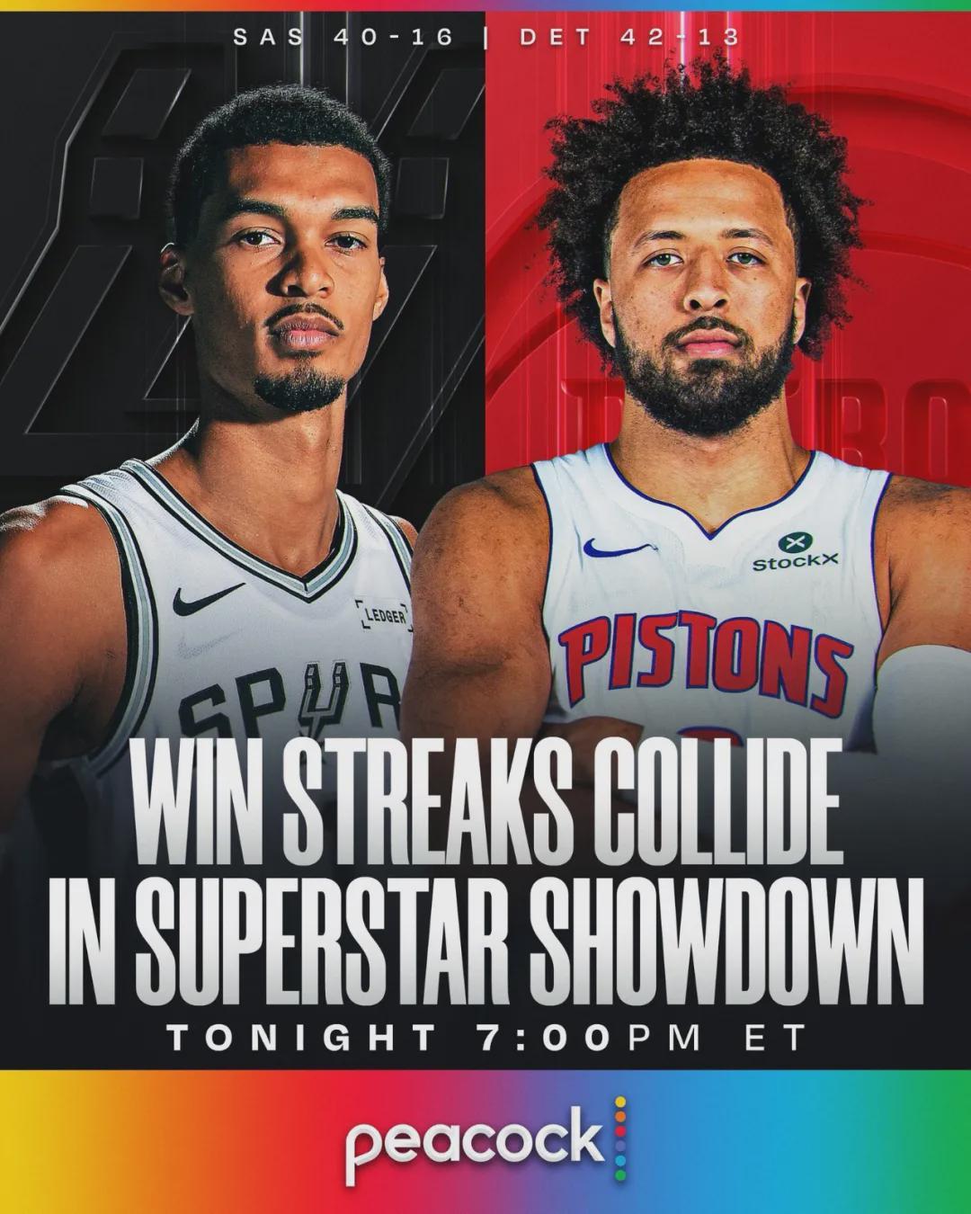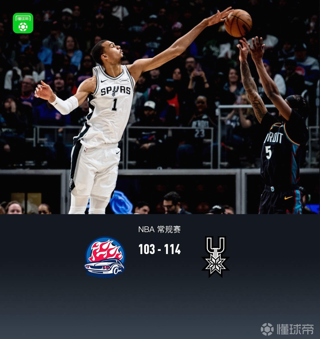 • 马刺114-103客胜活塞豪取9连胜,文班21+17+6帽,坎宁安26中5得16分